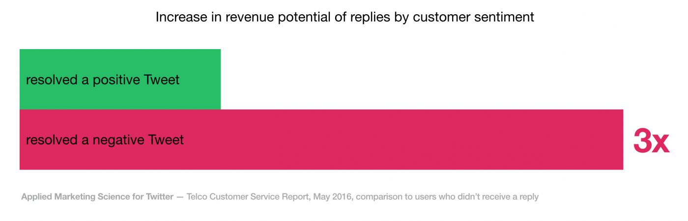 It turns out that responding to negative Tweets can create major positive impacts. 69% of people who Tweeted negatively say they feel more favorable when a business replies to their concern. And among telco customers, conversations that started with a negative Tweet resulted in higher brand favorability as well as 3X higher willingness to pay for their monthly wireless plan, compared to those whose original Tweet was positive.