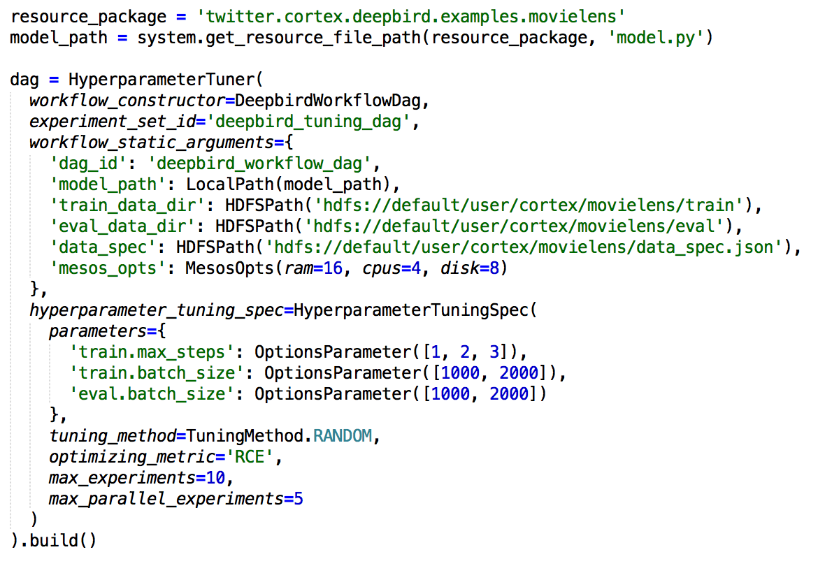 To make this more tangible, suppose a user has created a simple DeepBird model defined as a Python file which can be trained given some parameters. To apply hyperparameter tuning, the model needs to be wrapped in a SubDAG that exposes the parameters to the tuner.